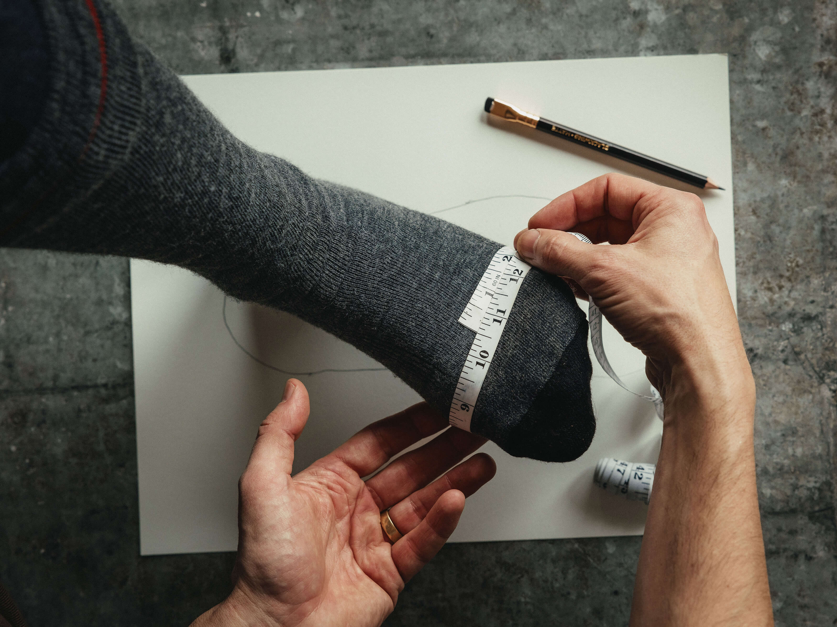 Sit down and cross your legs one over the other. This allows the foot being measured to be fully relaxed in its resting posture. Measure both feet using this method.For each measurement, pull the tape tight and then release it slightly so that it is snug, but not constricting.